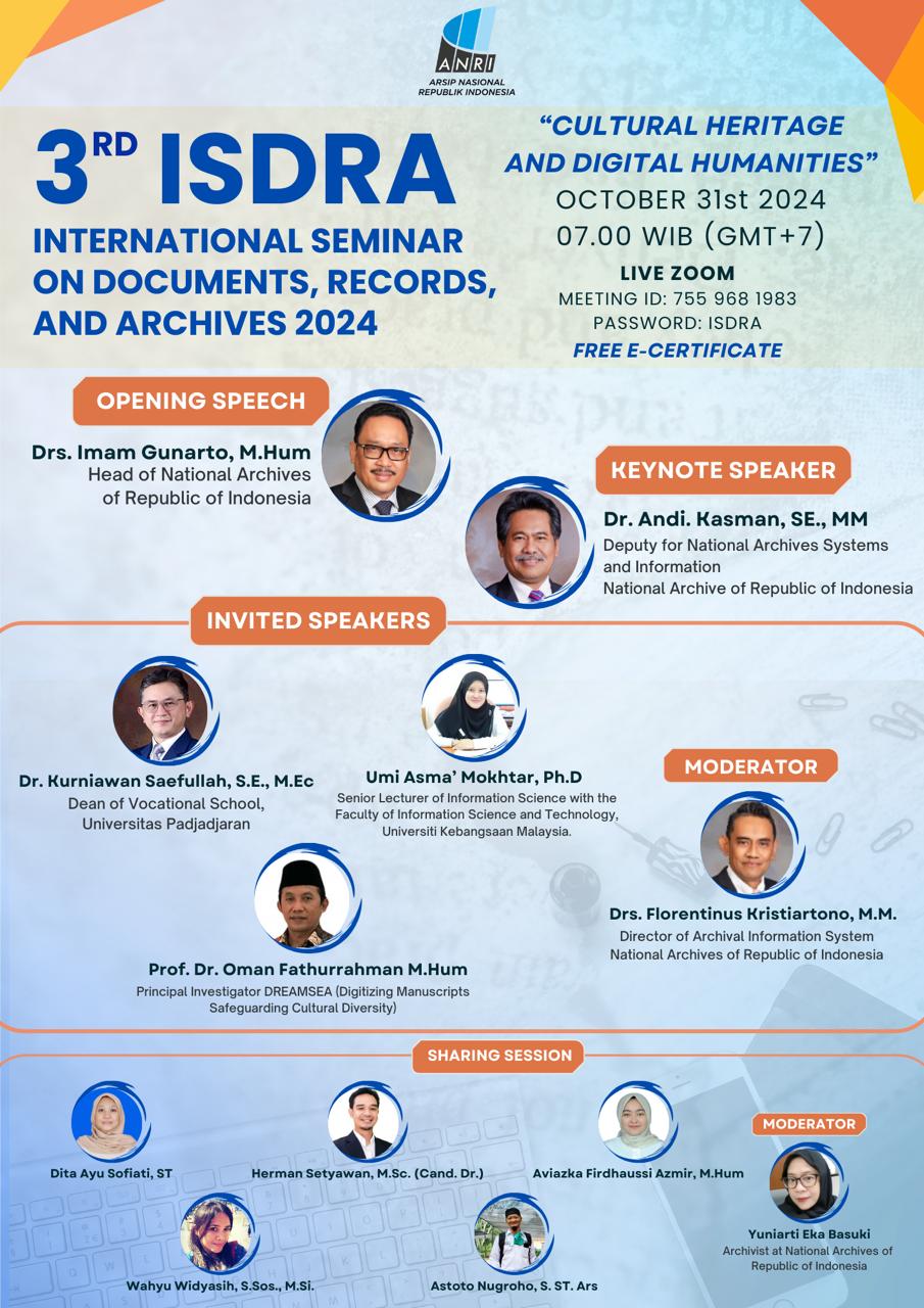 Surakarta, gugat.id – Arsip Nasional Republik Indonesia (ANRI) kembali menggelar 3rd International Seminar on Documents, Records, and Archives (3rd ISDRA) pada Kamis 31 Oktober 2024, dengan tema “Cultural Heritage and Digital Humanities“. Kegiatan ini diadakan secara daring melalui Zoom dan dihadiri oleh lebih dari 200 peserta dari berbagai instansi, termasuk perguruan tinggi dan kementerian.