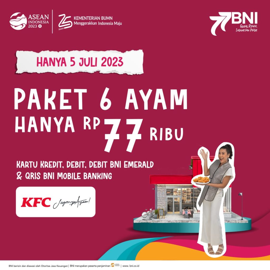 Pertama, Promo KFC. BNI mengajak nasabah untuk menikmati ayam goreng lezat di KFC dengan promo khusus pembelian paket 6 ayam dengan harga spesial hanya Rp 77 ribu pada tanggal 5 Juli 2023. Promo ini berlaku untuk pembayaran menggunakan kartu kredit, kartu debit, debit BNI Emerald, dan QRIS BNI Mobile Banking.