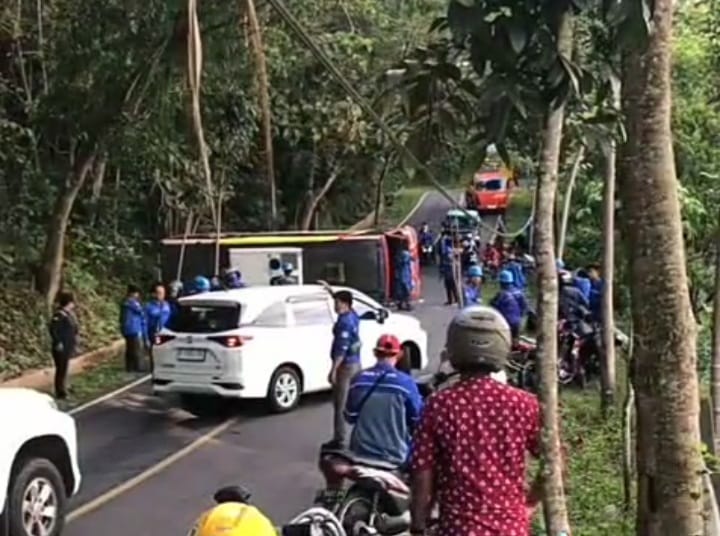 Namun nahas, saat bus mendekati area yang dituju, ternyata kendaraan tidak sanggup menyelesaikan tanjakan curam di tempat kejadian itu. Kendaraan melorot kembali turun, hingga terguling miring dalam posisi hampir menutup penuh badan jalan.