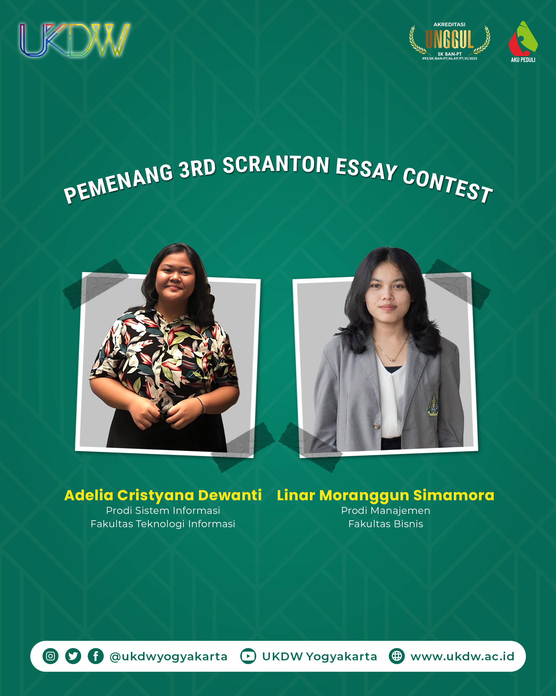 Yogyakarta, gugat.id – Dua mahasiswa Universitas Kristen Duta Wacana (UKDW) Yogyakarta menjadi pemenang 3rd Scranton Essay Contest dengan tema “What is Your Internal Strength and Power to Overcome Challenges in Today’s World?”. Kompetisi tingkat internasional ini diselenggarakan oleh Scranton Women’s Leadership Center. Sebagai pemenang, kedua mahasiswa UKDW ini mendapatkan beasiswa Scranton selama satu tahun dan tambahan beasiswa sebesar US$500. Kedua mahasiswa tersebut adalah Adelia Cristyana Dewanti dari Prodi Sistem Informasi Fakultas Teknologi Informasi dan Linar Moranggun Simamora dari Prodi Manajemen Fakultas Bisnis.