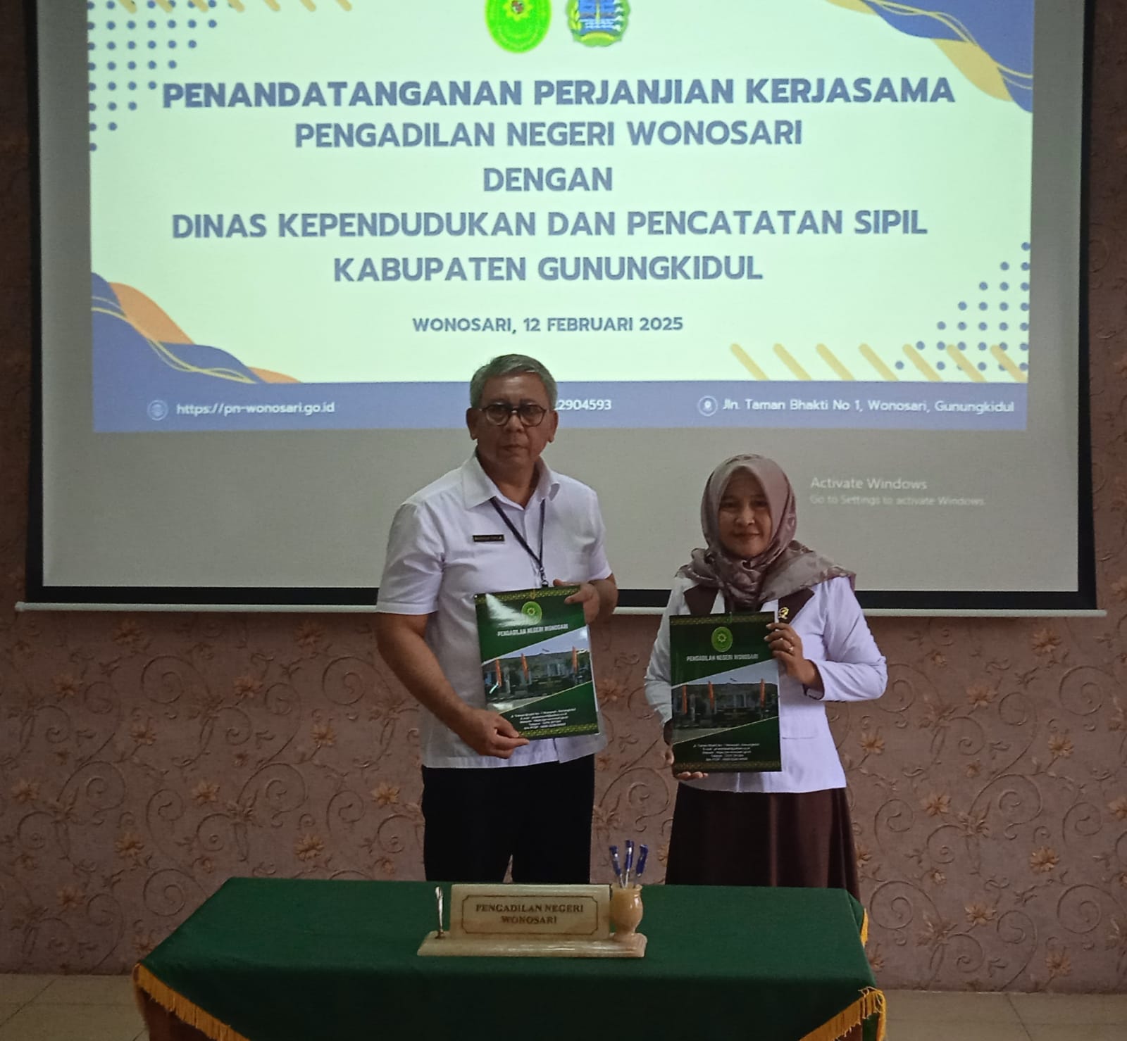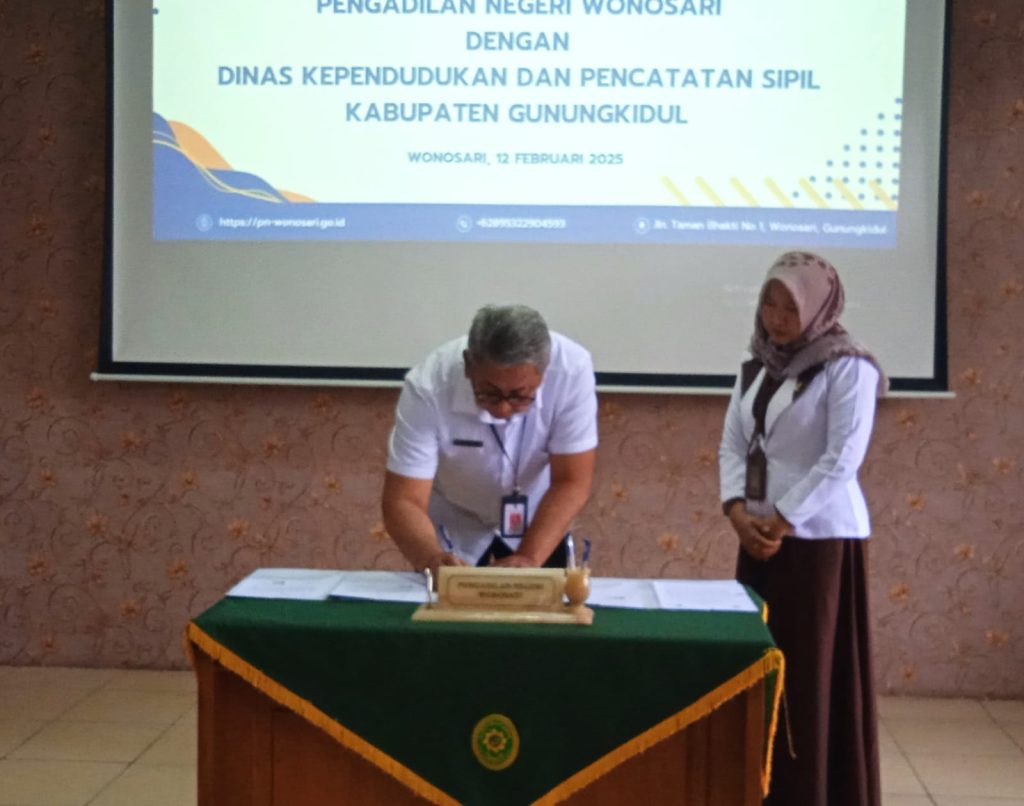Hari ini Rabu (12/2/2025), bertempat di ruang Command Center PN Wonosari, dilakukan penandatanganan dua perjanjian kerja sama antara kedua pihak. Kerja sama pertama terkait Pelayanan Terpadu Akta Kematian bagi Penduduk Setelah Menerima Penetapan Pengadilan Negeri, sedangkan kerja sama kedua mengenai Pelaporan Peristiwa Penting dan Peristiwa Kependudukan.