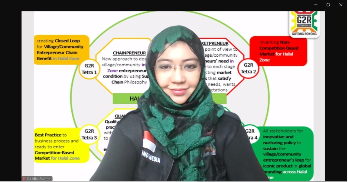 Rika Fatimah P.L., S.T., M.Sc., Ph.D, yang juga dosen FEB UGM sekaligus Ketua Departemen Industri Halal MES DIY, tampil sebagai salah satu pembicara. Ia mempresentasikan konsep Global Gotong Royong (G2R) Tetrapreneur on Halal: Iconic People Movement on New Entrepreneurship Development’s Standardization to Support Halal Economy.