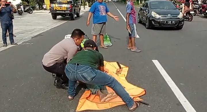 Sepeda pancal warna biru yang dikayuh korban tergeletak tak beraturan di sekitarnya. Sedangkan mobil warna hitam yang menabraknya, bergerak perlahan berusaha menepi ke sisi kanan jalur.
