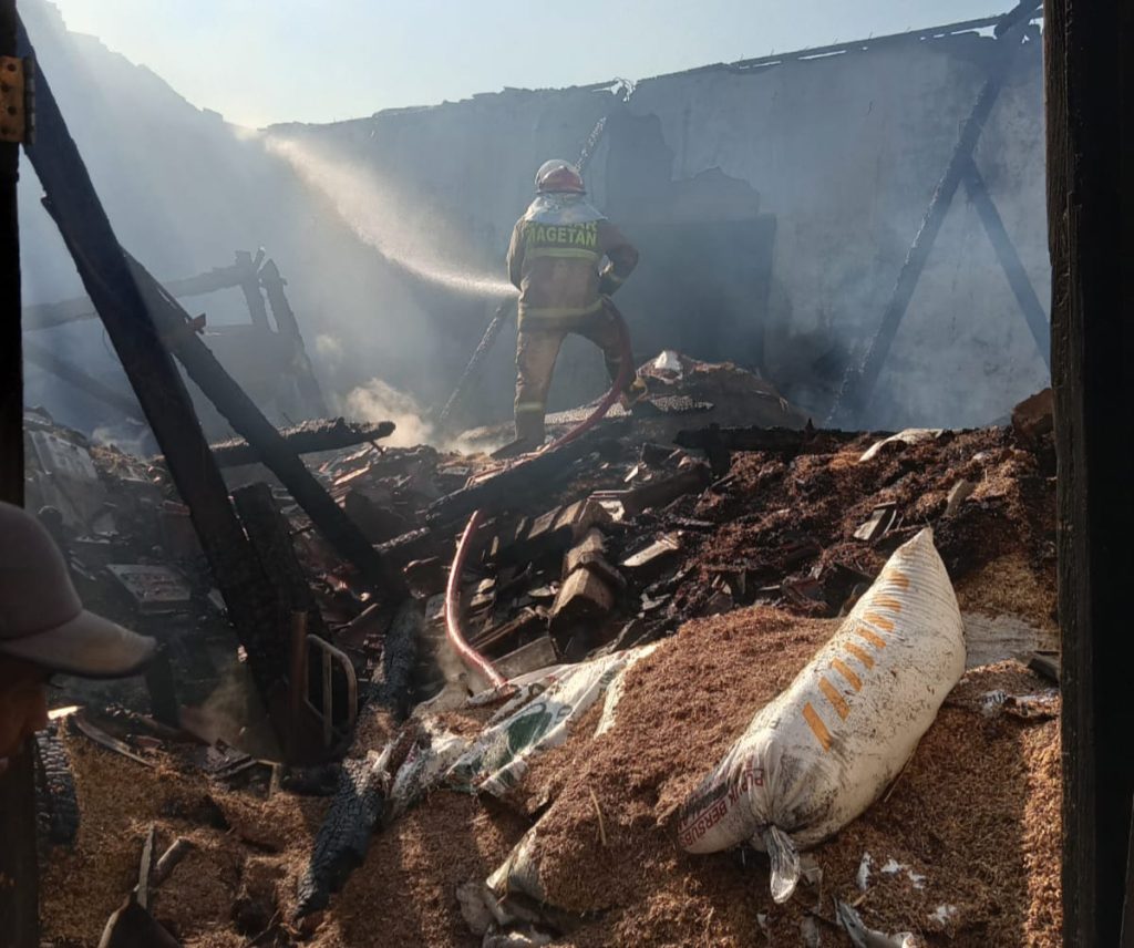 MAGETAN, gugat.id – Sebuah gudang penggilingan padi di Magetan, Jawa Timur, terbakar. Kebakaran yang diduga dipicu korsleting pada instalasi kelistrikan di area itu, menyambar puluhan glangsing gabah kering yang siap digiling, Jumat sore (16/8/2024).
