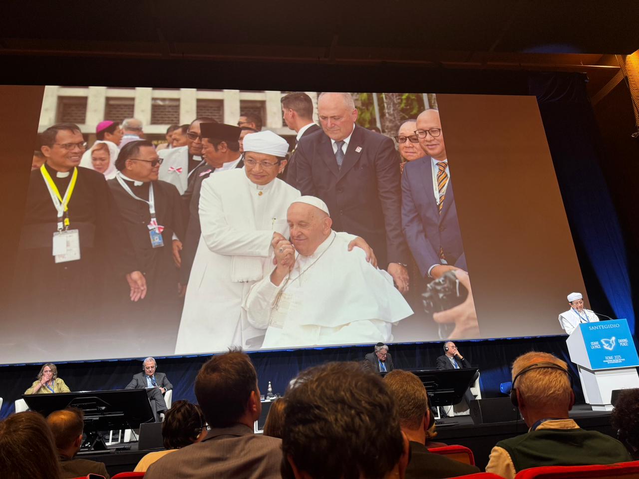 Dalam pidato yang emosional, Menag sempat terdiam ketika dua foto bersejarah terpampang di layar — saat dirinya mencium kening Paus Fransiskus dan saat Paus mencium tangannya. “Maaf, saya sangat emosional saat ini,” ucapnya disambut suasana hening dan haru dari para peserta.