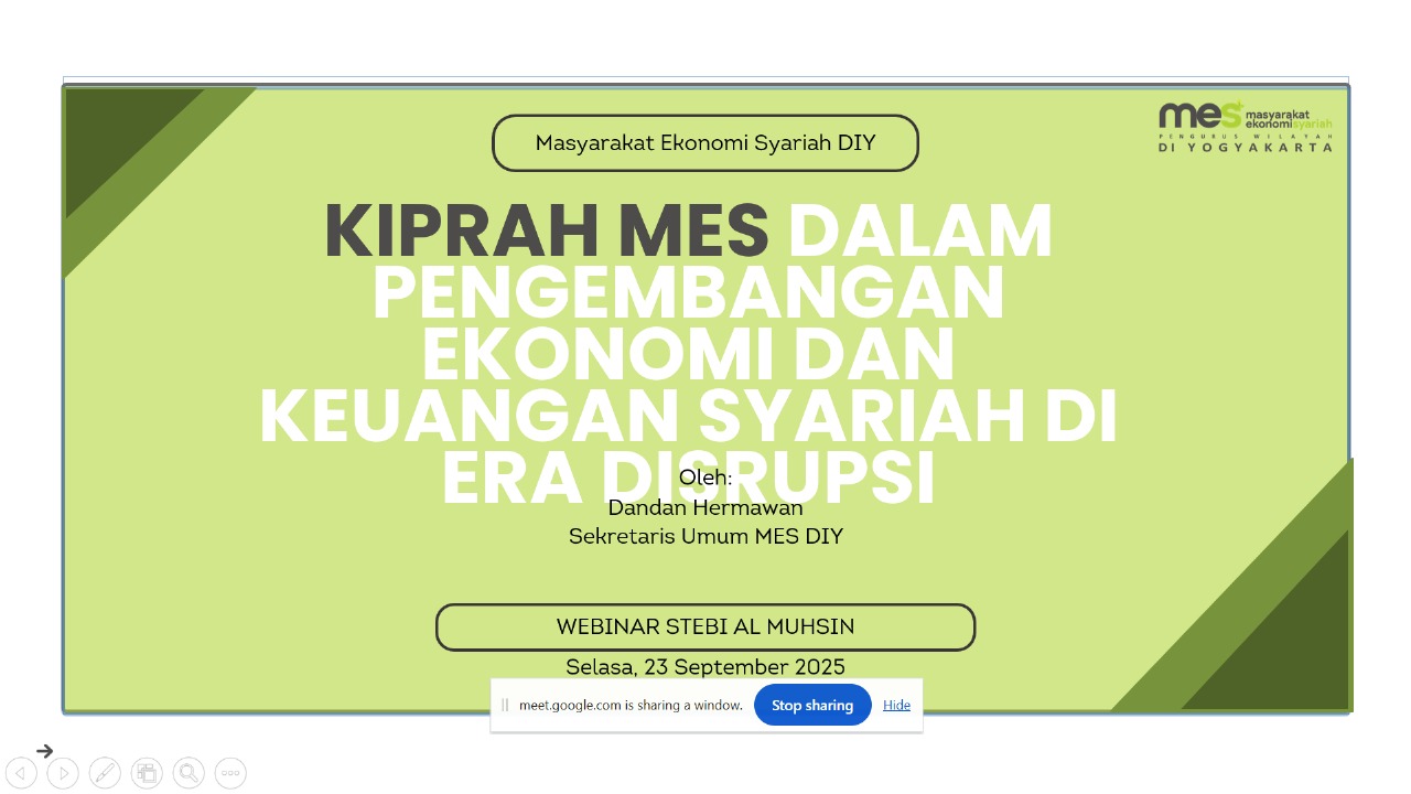 YOGYAKARTA, gugat.id – Perkembangan ekonomi dan keuangan syariah di Indonesia terus menunjukkan tren positif meski tantangan era disrupsi kian kompleks. Masyarakat Ekonomi Syariah Daerah Istimewa Yogyakarta (MES DIY) menegaskan komitmennya untuk menjadi motor penggerak literasi, inovasi, dan kolaborasi lintas sektor. Hal itu tercermin melalui keterlibatan MES DIY sebagai narasumber dalam Webinar Nasional Stadium Generale bertema “Mendorong Kreativitas Inovatif dalam Perbankan dan Ekonomi Syariah di Era Disrupsi” yang digelar Sekolah Tinggi Ekonomi dan Bisnis Islam (STEBI) Al Muhsin Yogyakarta, Selasa (23/9).
