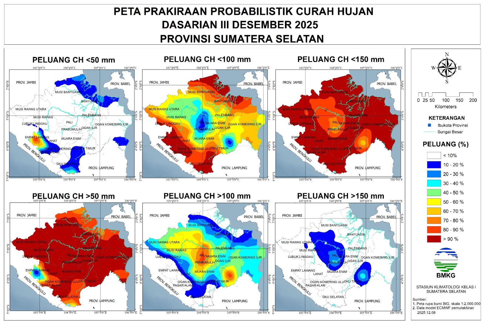 BMKG memprediksi sebagian besar wilayah Sumatera Selatan memiliki peluang lebih dari 80% mengalami curah hujan kategori menengah (51–150 mm) pada Dasarian II Desember 2025. Hanya sebagian wilayah Empat Lawang bagian tengah yang berpotensi mengalami curah hujan rendah (0–50 mm).