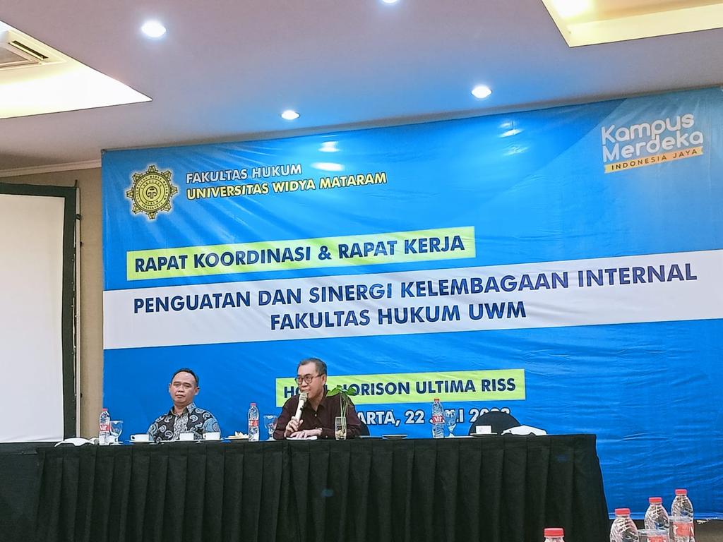 Dekan FH UWM dalam sambutannya menyampaikan bahwa rapat kerja ini merupakan kelanjutan dari Rapat Koordinasi Universitas yang lebih khusus ditujukan untuk memperkuat dan meningkatkan sinergi kelembagaan internal FH UWM.