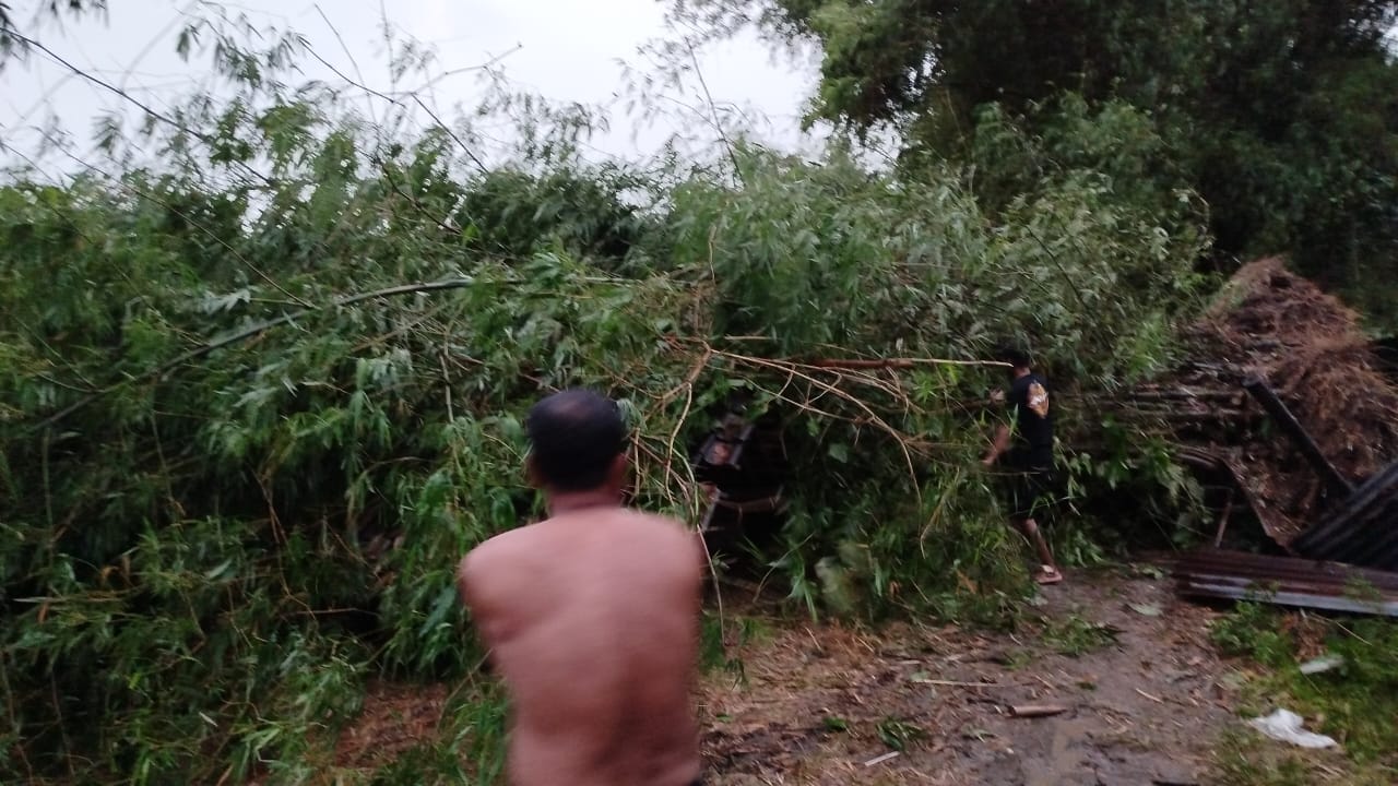 Cuaca buruk itu memicu tumbangnya barongan bambu yang tumbuh di area tepi persawahan Keluarahan Kraton.