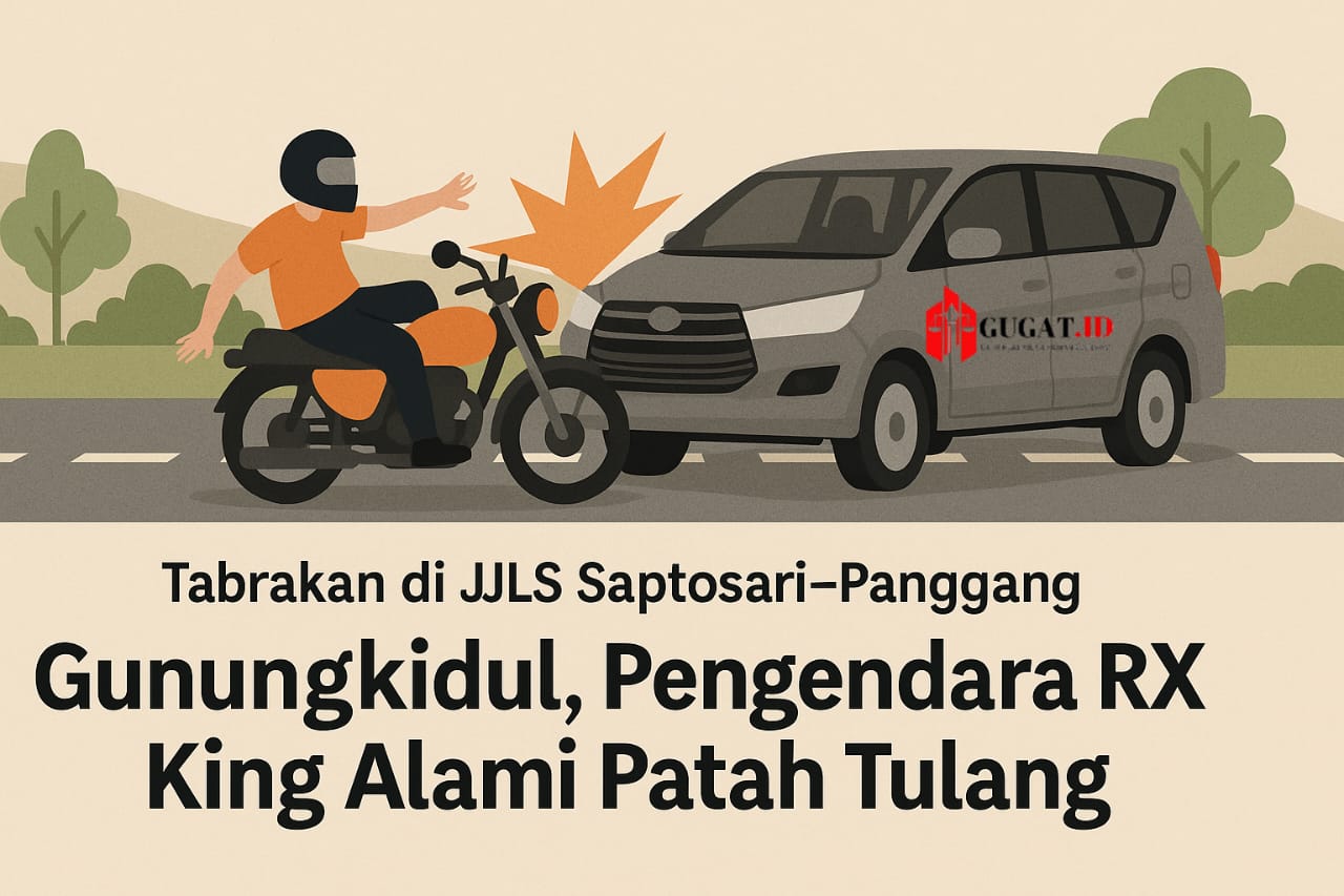 GUNUNGKIDUL, gugat.id – Kecelakaan lalu lintas kembali terjadi di ruas jalan JJLS Saptosari-Panggang, tepatnya di Dusun Temanggung, Kalurahan Jetis, Kapanewon Saptosari, Kabupaten Gunungkidul, Rabu (11/6/2025) sekitar pukul 13.05 WIB. Peristiwa ini melibatkan sepeda motor Yamaha RX King dan mobil penumpang Toyota Kijang Innova.