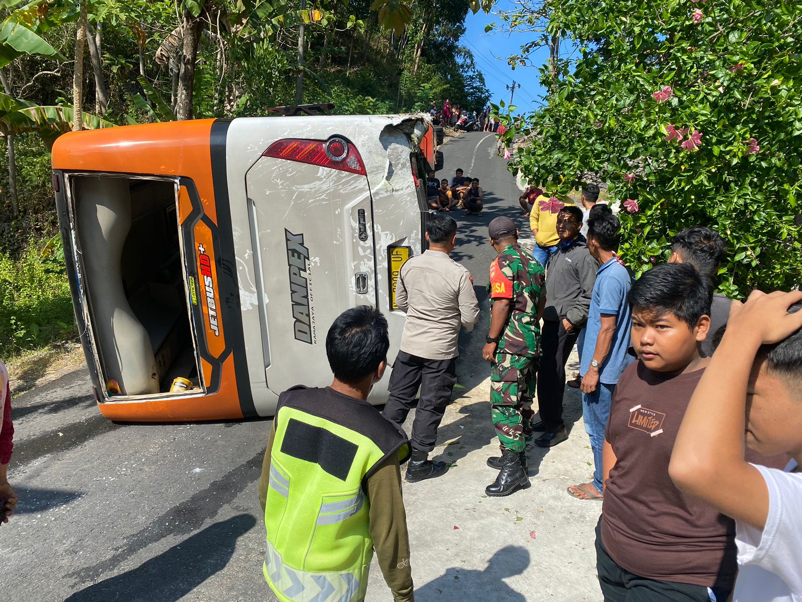 “Benar sekira pukul 09.30 WIB, rombongan melaju dari arah utara menuju ke Pantai Ngobaran sesampainya di TKP Bus tidak kuat melewati tanjakan kemudian mesin mati dan sopir tidak bisa mengendalikan laju Bus sehinga mengakibatkan Bus mundur menabrak pondasi rumah warga dan terguling ke kiri,” jelas Kapolsek.