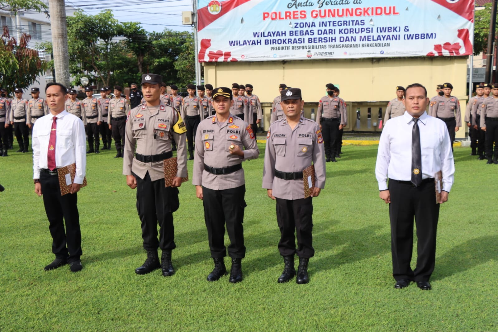 Gunungkidul (gugat.id) – Upacara Korp Raport kenaikan pangkat pengabdian & pemberian reward personil Polres Gunungkidul digelar di halaman Upacara Polres Gunungkidul, hari ini Senin (03/04/23).