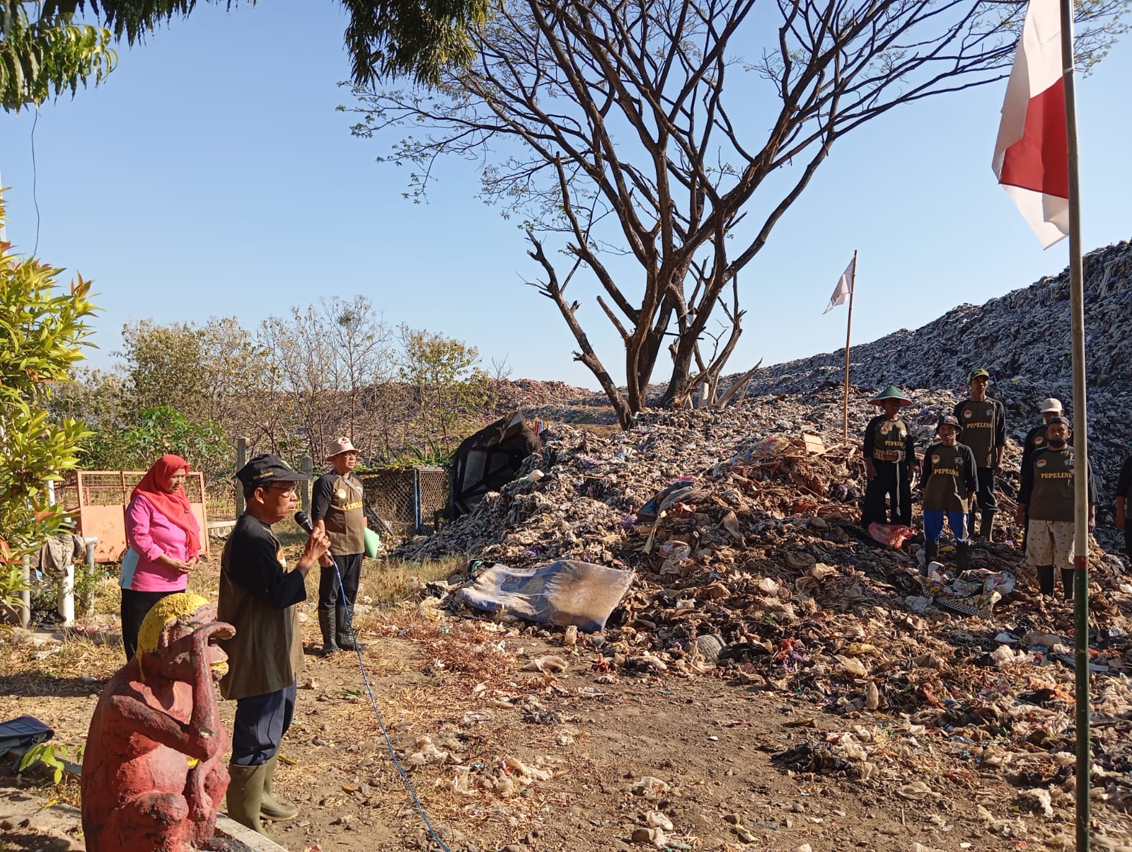 Mengenakan seragam kebesarannya, baju, sepatu, topi dan kelengkapan lain yang khas dikenakan para pencari sampah dan barang bekas. Mereka berdiri baris diantara gunungan sampah, dengan sang saka merah putih yang berkibar di tiang bambu sebagai pusat khidmatnya.